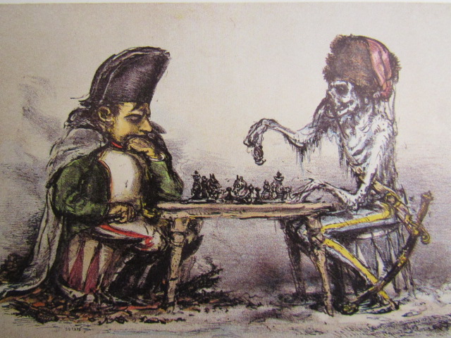 For far too many, war is something like a game, as shown in this telling image of Napoleon playing chess against the Russian Winter (Andreas Paul Weber). So many of us are only pawns in the “game” of war. Where is the glory here, emperor?
