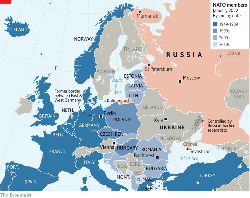 The caption from the Economist suggested this map showed how Russia was menacing Ukraine! And that NATO was unlikely to retreat