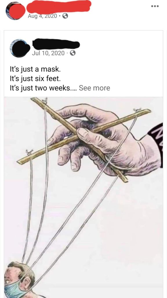 Consider the many theories afloat about Covid-19. Scrolling through the Facebook posts of anti-maskers and anti-vaxxers curated on the Herman Cain Award subreddit, one is struck by the sheer quantity of conspiratorial memes circulating among networks of likeminded Facebook friends. The Covid pandemic is variously presented as the product of a nefarious plot enacted by the Chinese government or by the US government or by the Centers for Disease Control or…the list goes on. Public health measures that have been recommended or mandated at the federal, state or local levels such as quarantining, masking, and vaccinating are similarly condemned as elements of the conspiratorial machinations of Anthony Fauci or Bill Gates (or both of them working in cahoots), of profiteering Big Pharma, of collectivizing communists, of Medicare-For-All socialists, and so on.