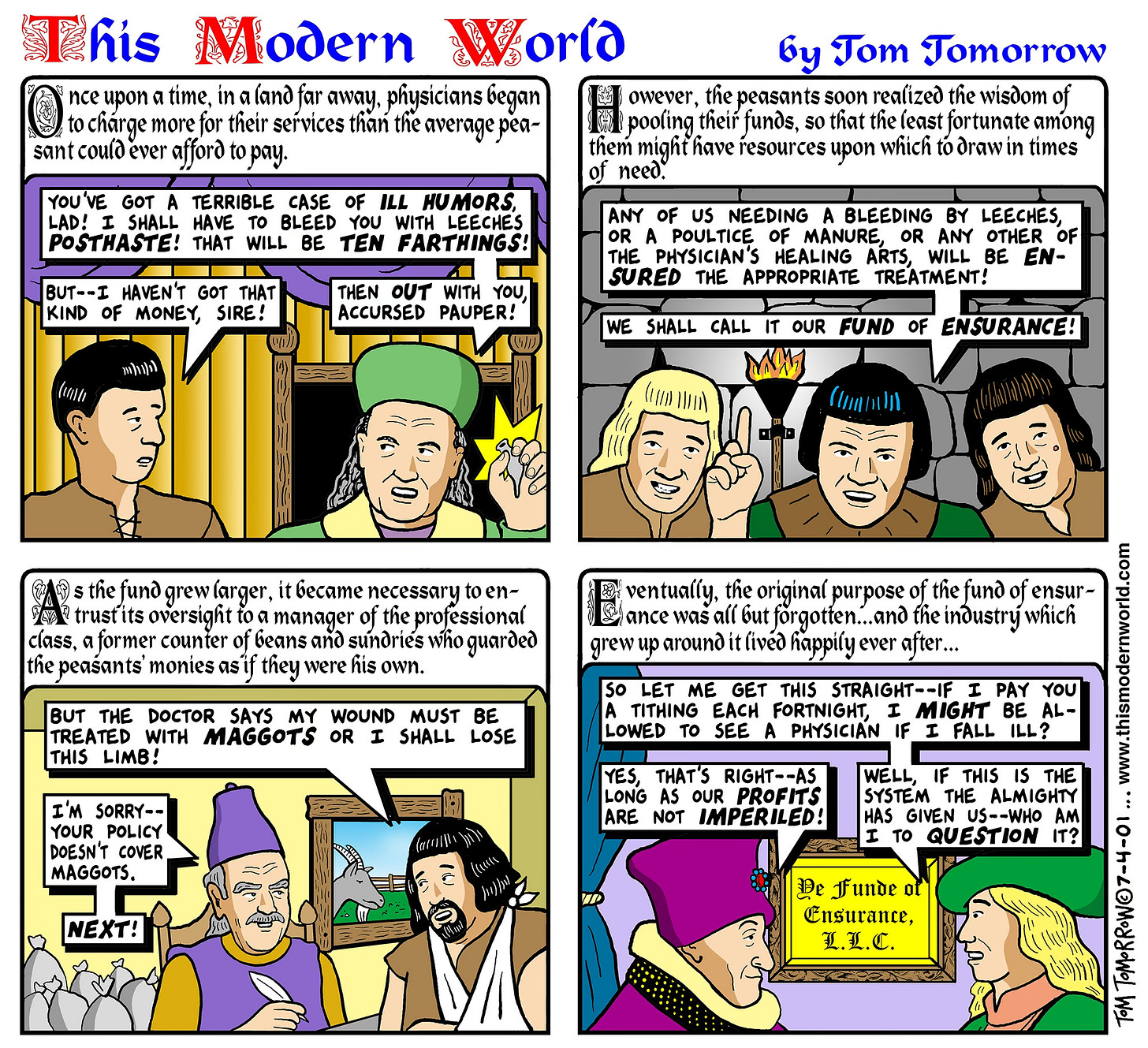 America primarily has a privatized health care system where profit is the prime directive. (Programs like Medicare* and Medicaid are a public-private partnership and are government-funded; the former focuses on people 65 and older, the latter on the poorest of Americans.) Most Americans get their private health insurance with their job, else they’re required to buy private health insurance on their own nickel. These health insurance plans are expensive and often come with high deductibles and co-pays.