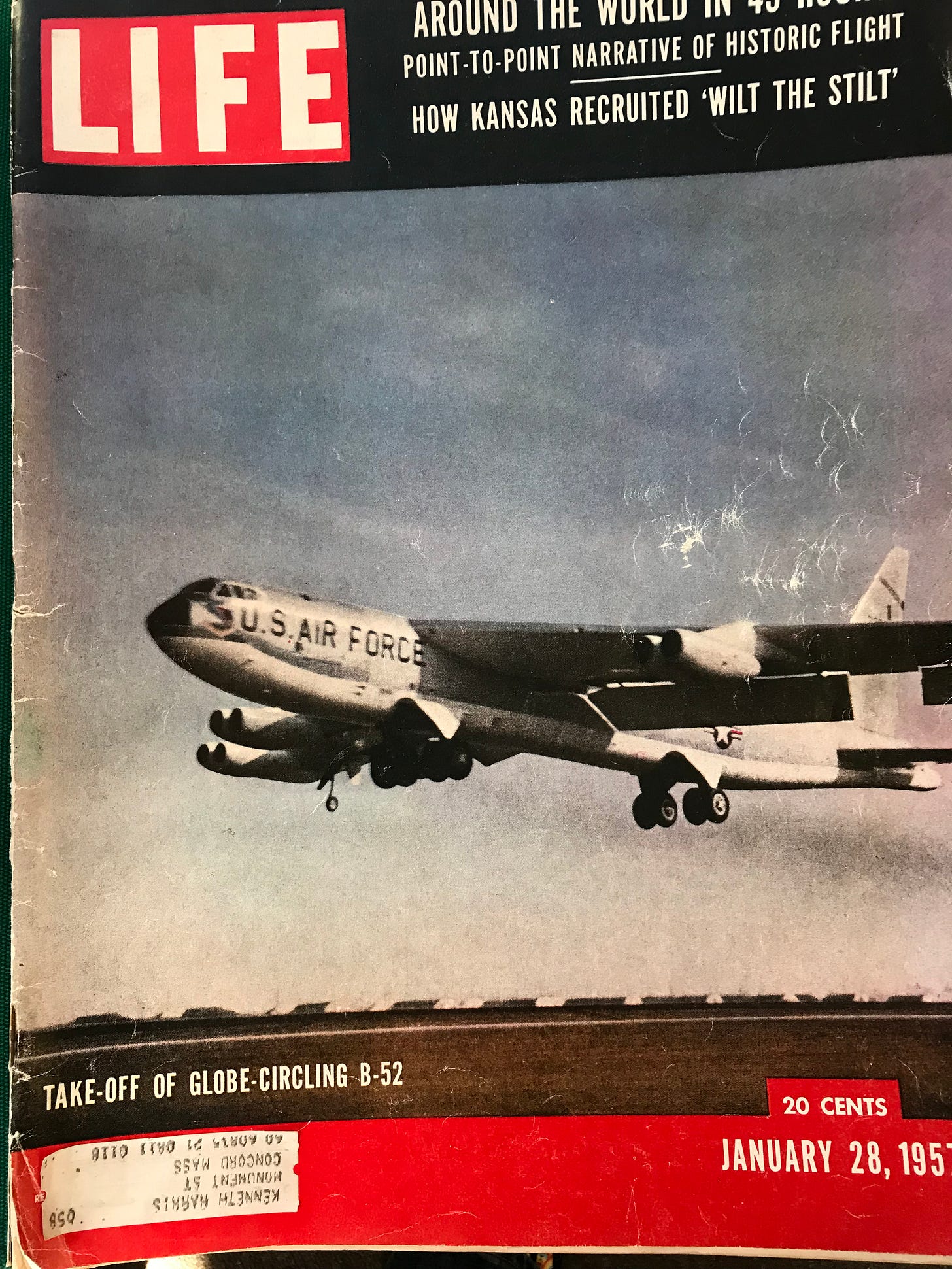 The first cover celebrated the newish B-52 nuclear bomber that circumnavigated the globe in record time (for the year 1957). Incredibly, the Air Force still relies on updated B-52s today for global bombing missions. Note how the cover mentions nothing about the B-52’s purpose, which was (and remains) to carry nuclear payloads with yields in the megatons of explosive force, anywhere on the globe.