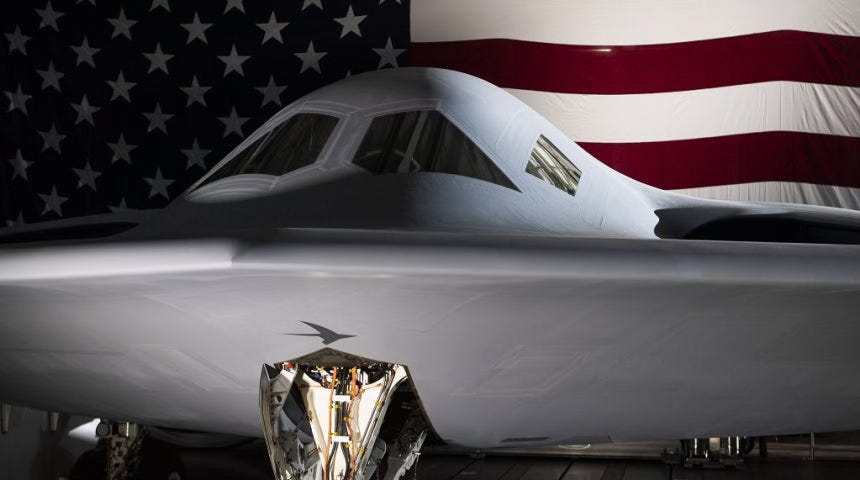 The B-21 Raider, with American flag (Northrop Grumman photo)